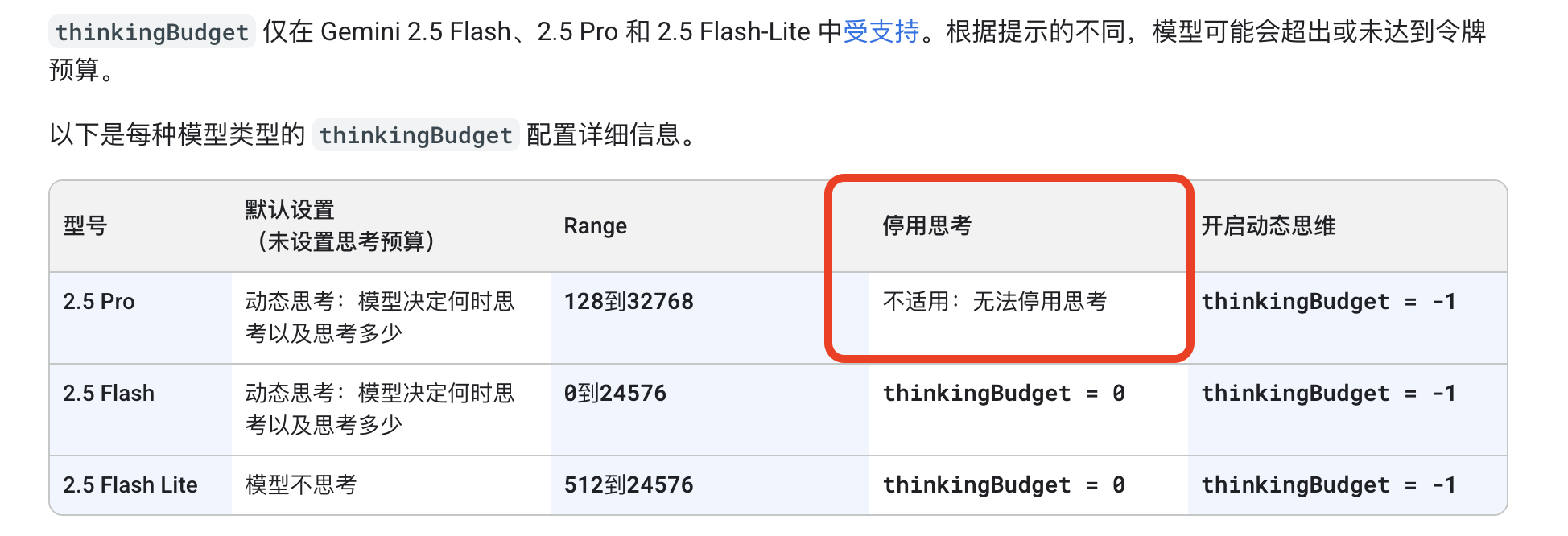 注意:Gemini 2.5 Pro 和 2.5 Flash 默认开启思考功能。对于 2.5 Pro 型号,无法关闭推理功能。