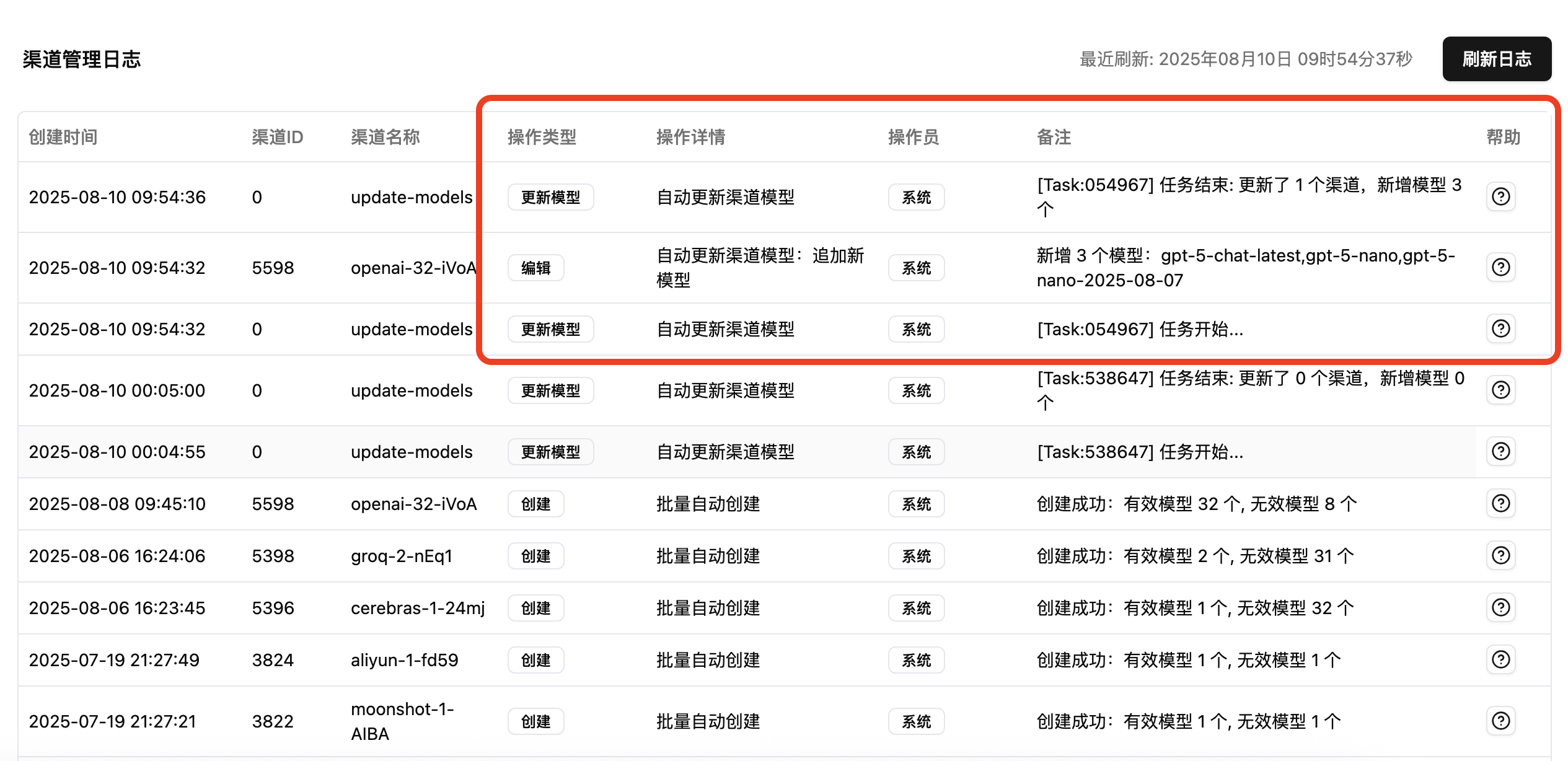 执行后,系统将自动检测并批量添加所有已启用渠道中尚未配置的模型,并生成完整的管理日志。