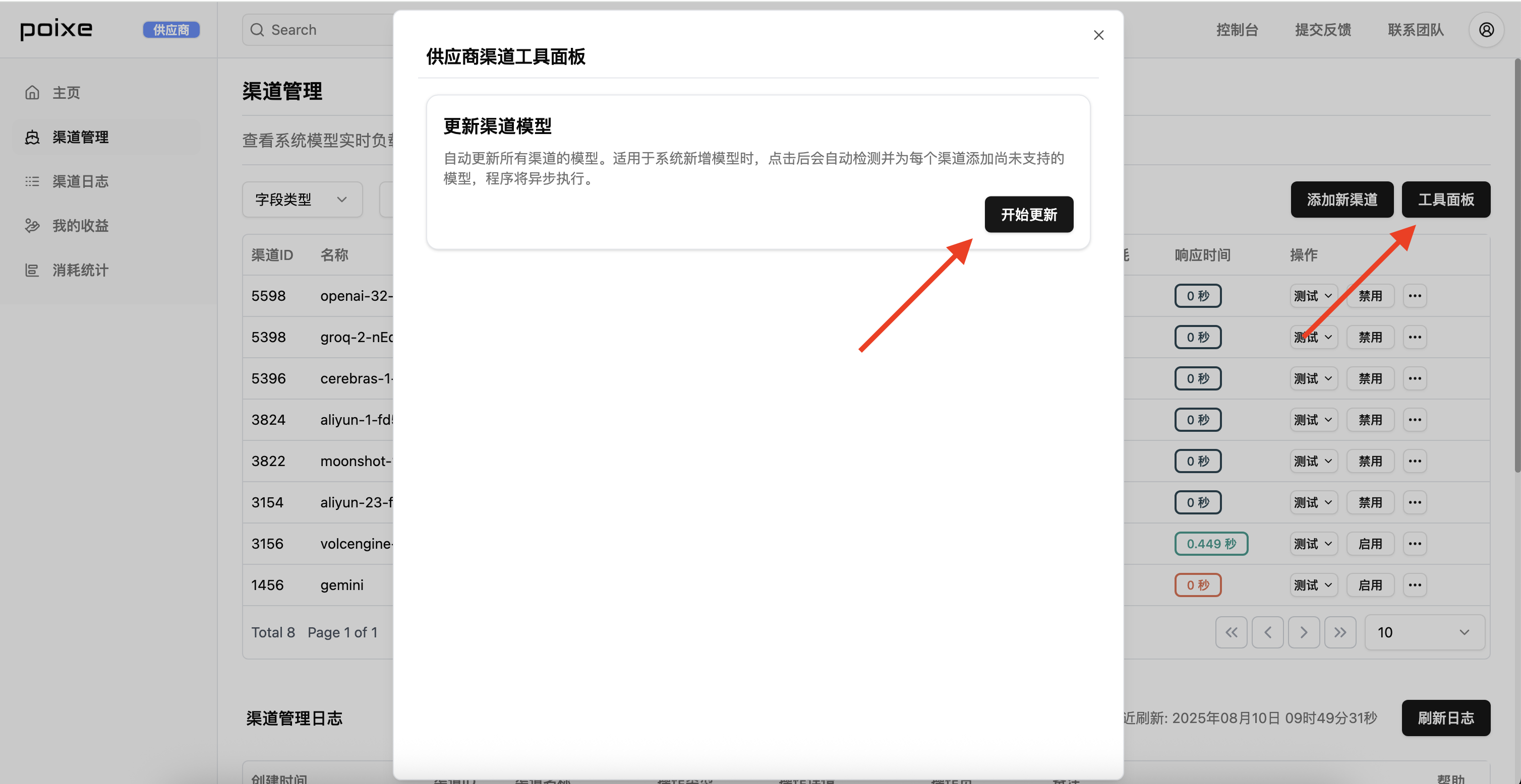 平台供应商可在 渠道管理 页面右上角点击 【工具面板】,选择 【更新渠道模型】。